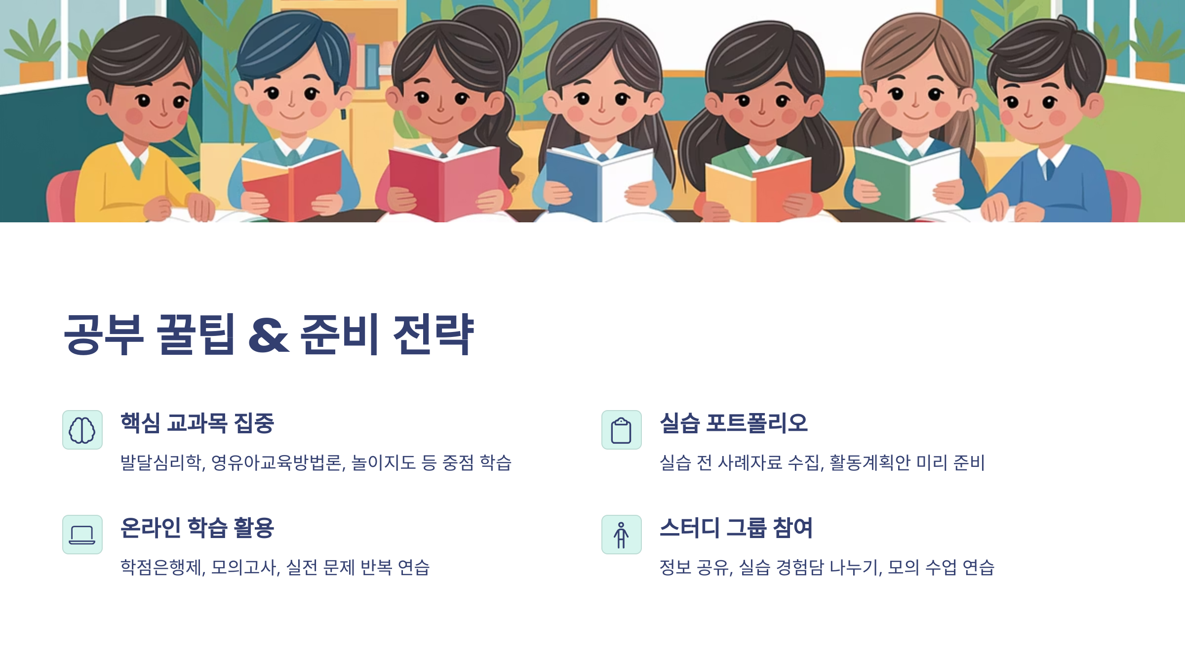 보육교사 자격증을 준비할 땐 단순히 공부만 잘하는 것보다 ‘계획적으로 차근차근 준비’하는 게 더 중요해요. 이 자격은 시험이 있는 1급을 제외하면 이수 과목과 실습이 전부라서, 시간과 일정 관리만 잘하면 누구나 도전할 수 있어요!