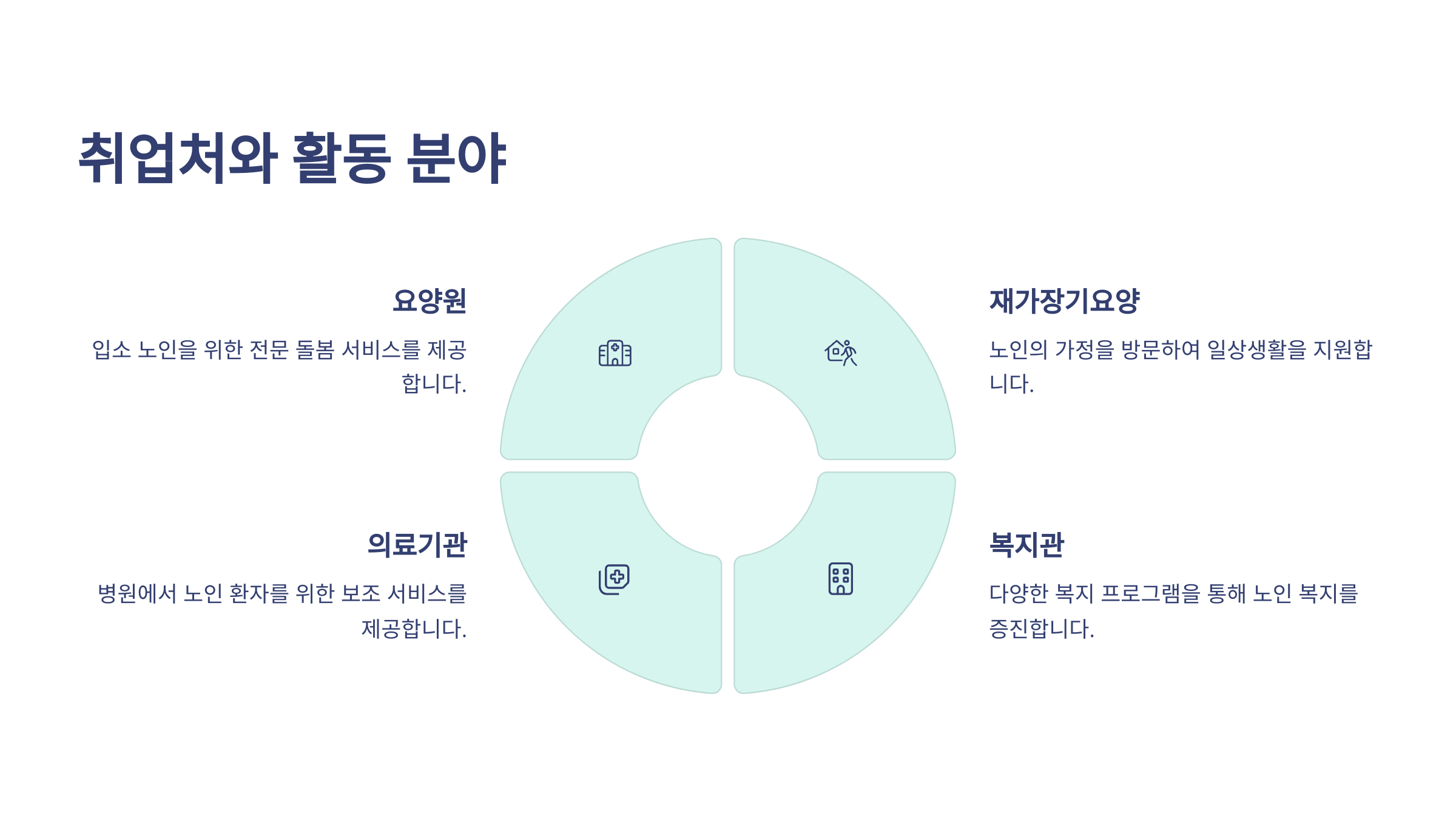 | 요양병원 | 입원 환자 생활 보조 | 의료 협업 |