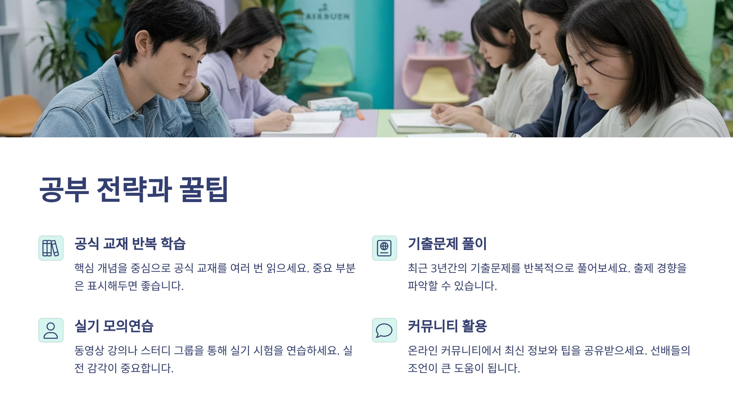 공부는 교육원 수업을 잘 듣는 게 제일 중요해요. 수업이 시험 대비로 잘 구성되어 있기 때문에, 필기하면서 복습만 잘해도 합격은 무리 없어요. 특히 강사가 강조한 부분은 반드시 시험에 나온다고 생각하고 외워야 해요!