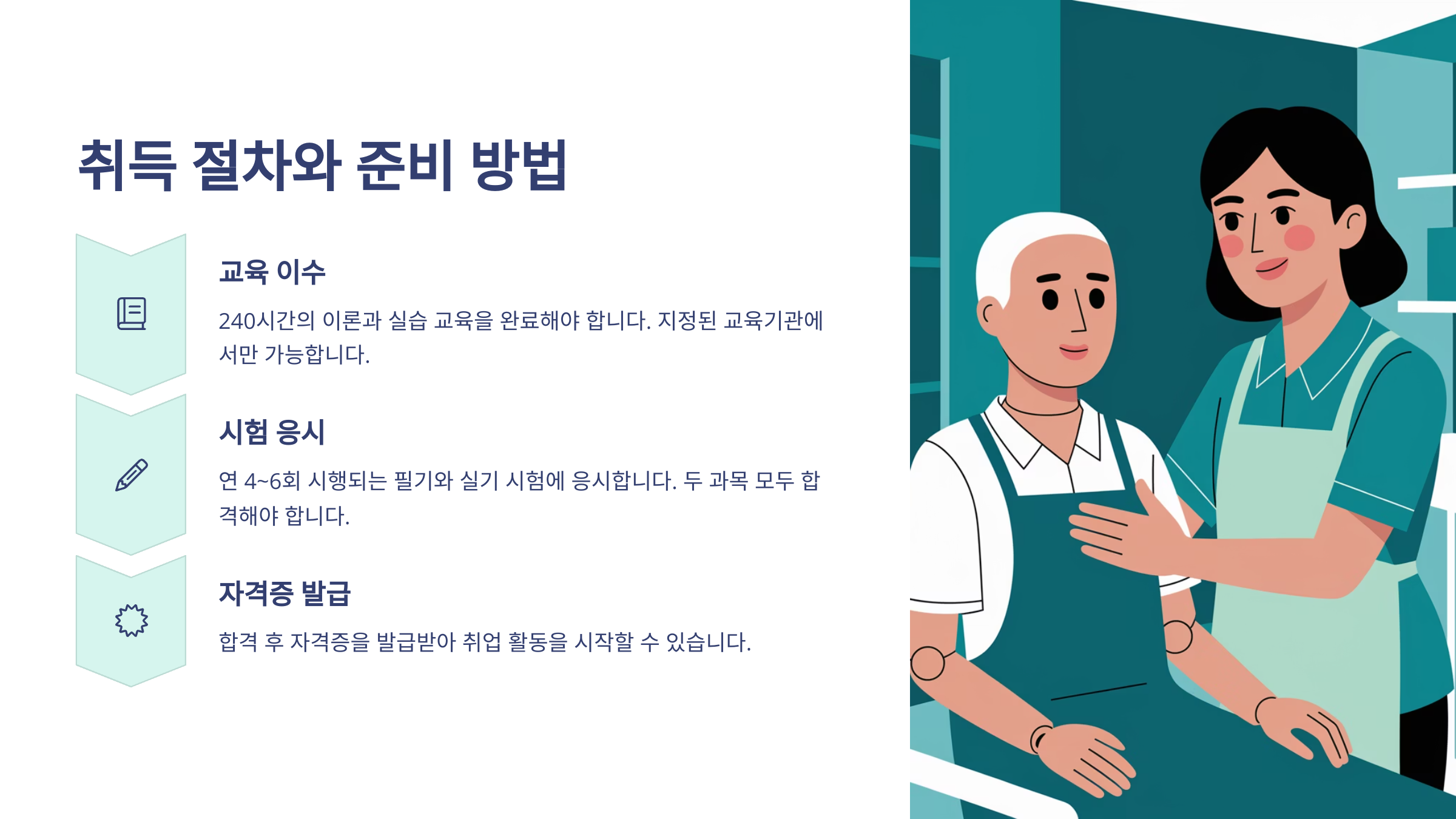 요양보호사 자격증은 크게 세 단계로 나눠서 준비하면 돼요: 교육 이수 → 시험 응시 → 자격증 발급. 이 과정을 하나씩 차근차근 밟으면 누구나 자격증을 취득할 수 있어요. 어렵지 않지만, 일정 관리가 핵심이에요! ⏳
