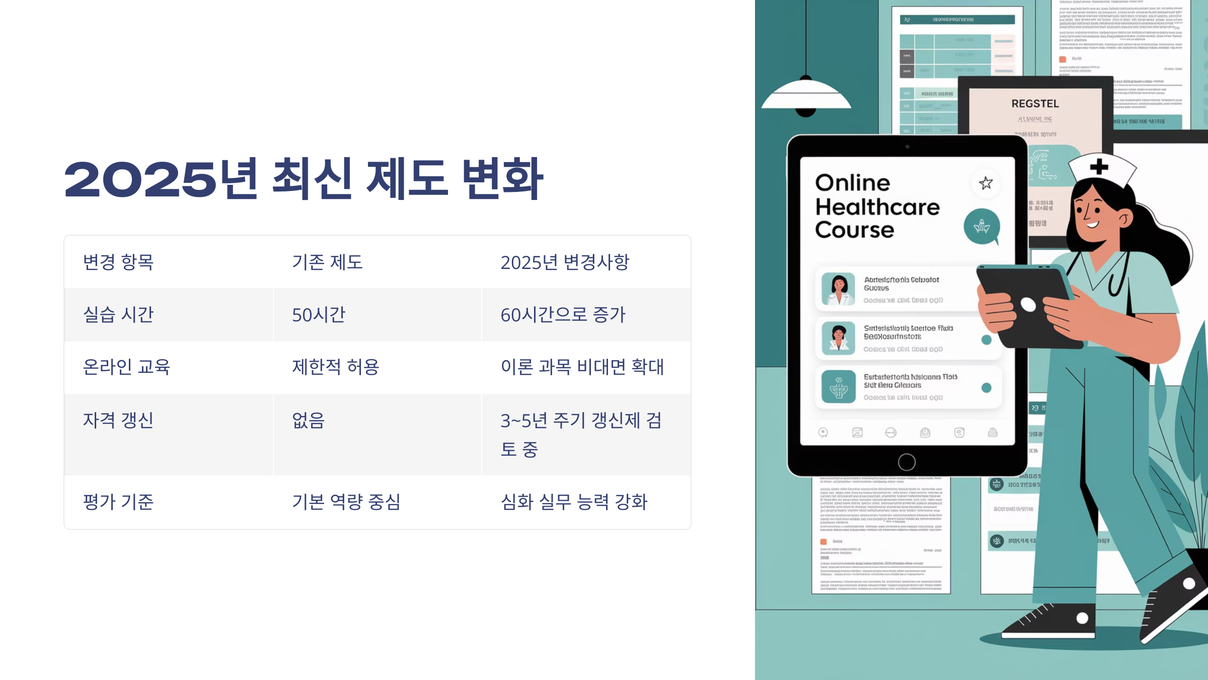 A8. 온라인 교육 확대(최대 50%), 실습 기준 강화, 자격증 전자 발급 등 제도적으로 더 편리하고 체계적으로 바뀌었어요!