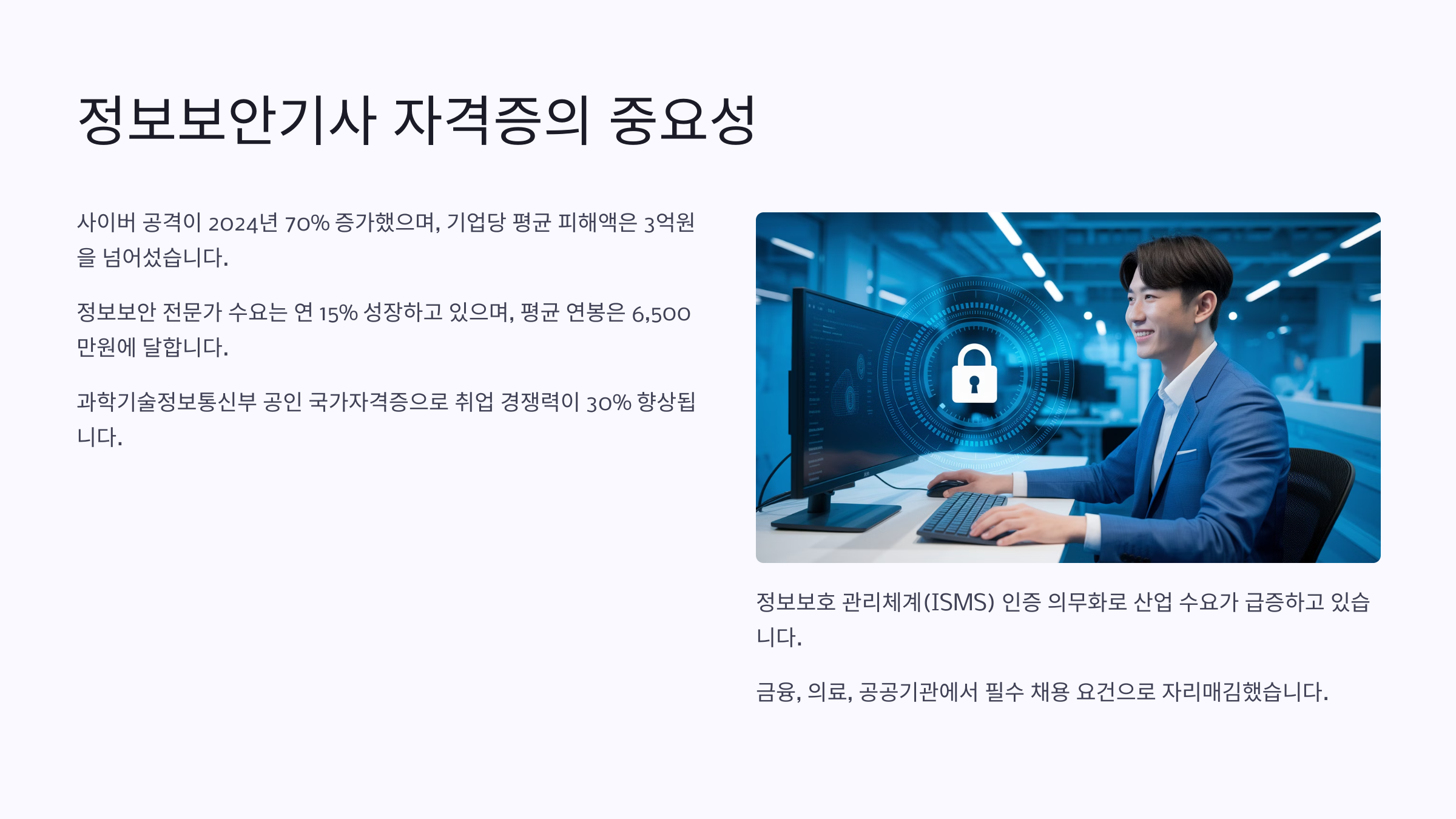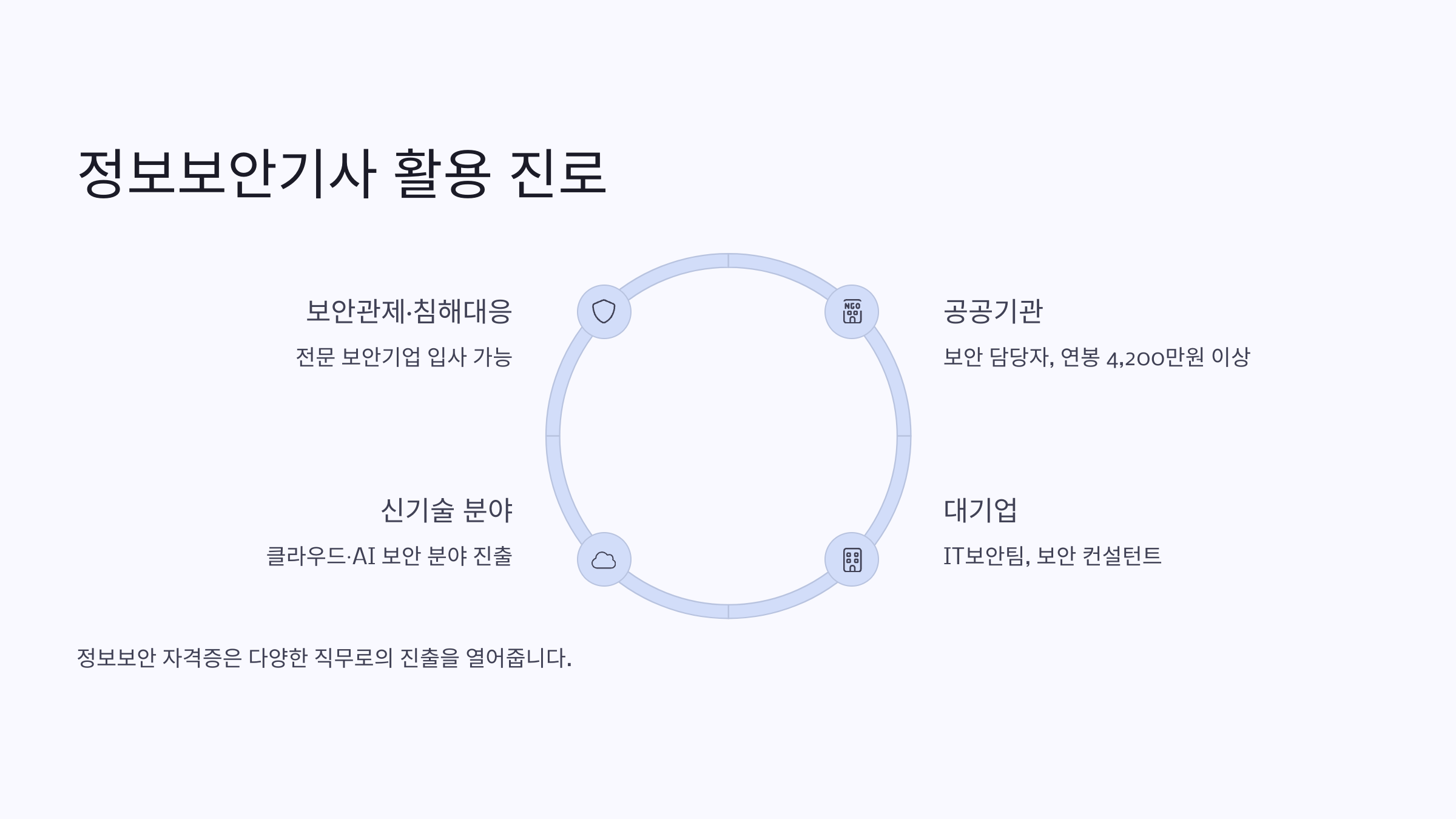 정보보안기사는 미래지향적인 자격증이에요. 디지털 시대가 계속될수록 사이버 보안 수요는 더 커지고, 이 자격증은 여러분의 커리어를 ‘지속 가능한 무기’로 만들어줄 거예요! 🚀