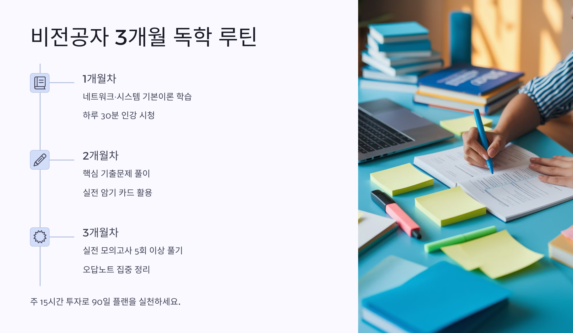 비전공자도 정보보안기사에 합격할 수 있어요! 핵심은 '이론 → 기출 → 실기'의 흐름을 잘 유지하는 거예요. 하루 2~3시간씩, 총 90일 기준으로 짜본 루틴을 소개할게요. 공부는 꾸준함이 생명이니까 무리하지 않는 게 중요해요! 💪