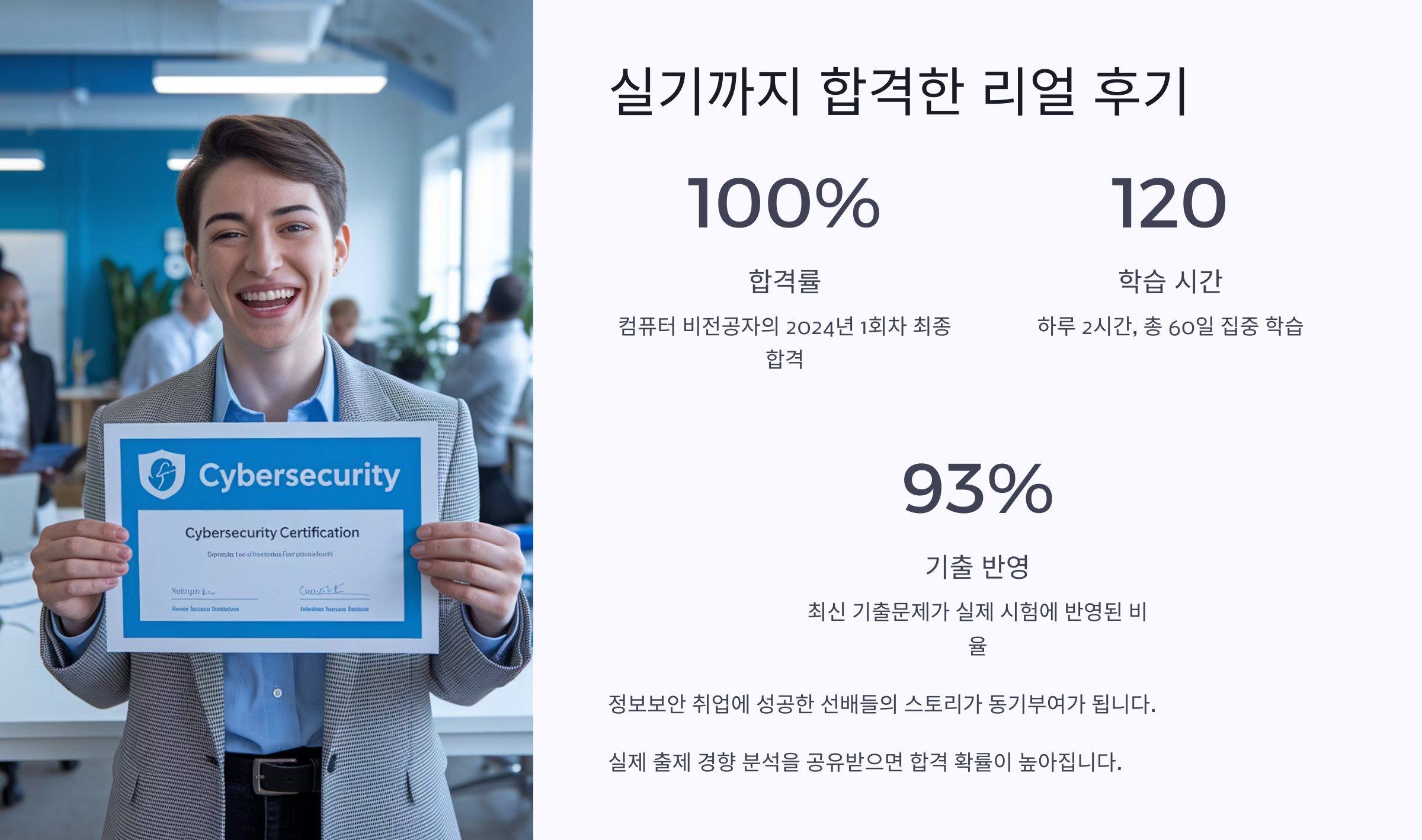 “비전공자라서 처음엔 정보보안기사? 나랑 상관없는 자격증이겠지…”라고 생각했었어요. 하지만 보안에 흥미가 생기면서 자격증 도전을 결심했고, 꾸준히 루틴대로 따라가니까 진짜로 3개월 만에 실기까지 한 번에 붙었어요! 😭