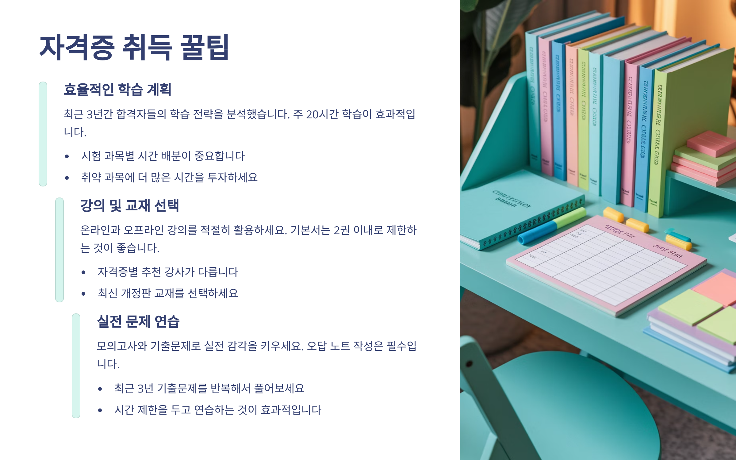 무엇보다 중요한 건 ‘지속성’이에요. 3일 하고 포기하는 분들이 너무 많은데, 하루 1시간이라도 꾸준히 하면 반드시 합격할 수 있어요! 🎯