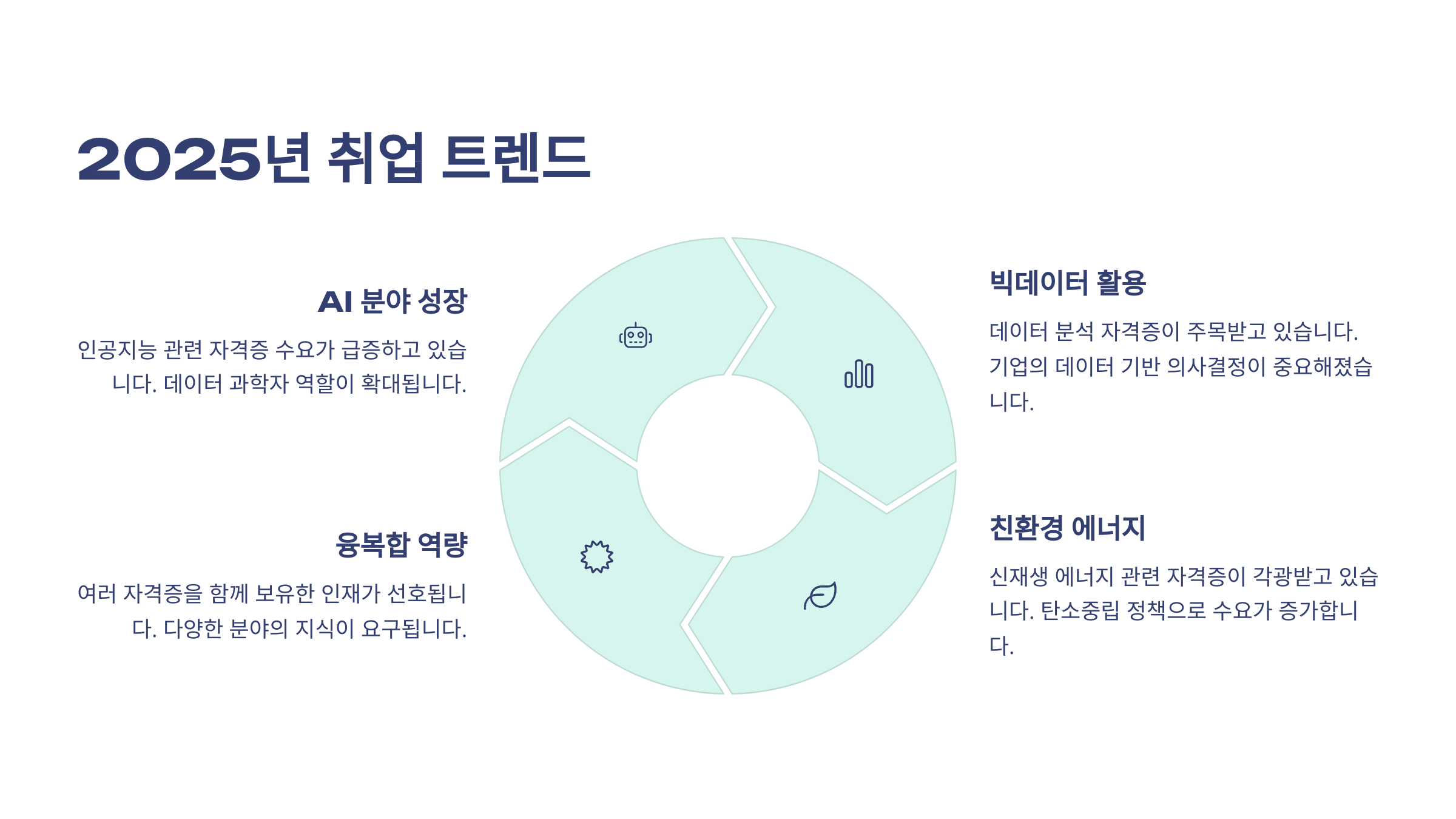 특히 기술 자격증 분야는 2025년에도 유망해요. AI, 반도체, 데이터 센터 관련 산업의 확대는 전기·기계·전자 관련 기술 자격증의 수요를 폭발적으로 늘리고 있거든요. 그래서 취업 시장에서는 자격증 하나로 연봉 4,000만원에서 6,000만원 사이의 포지션을 잡을 수도 있답니다.