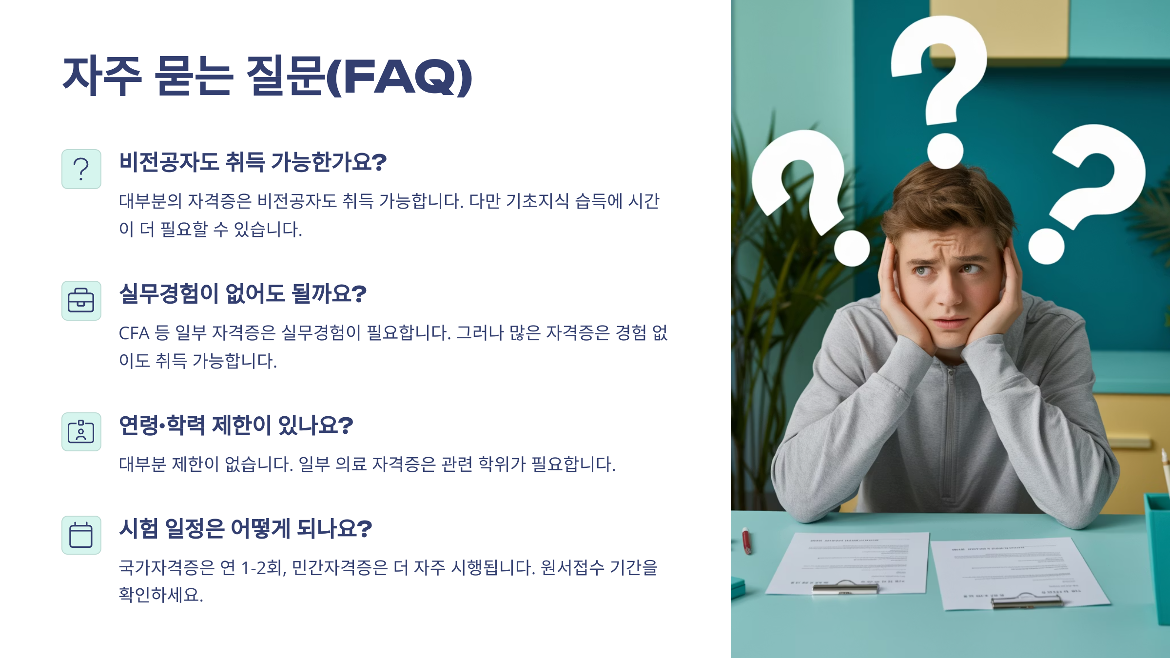 A6. 네! 대부분의 자격증은 연간 2~3회 이상 시험 기회가 있어요. 기출문제 반복을 통해 재도전하면 합격률도 점점 올라가요.
