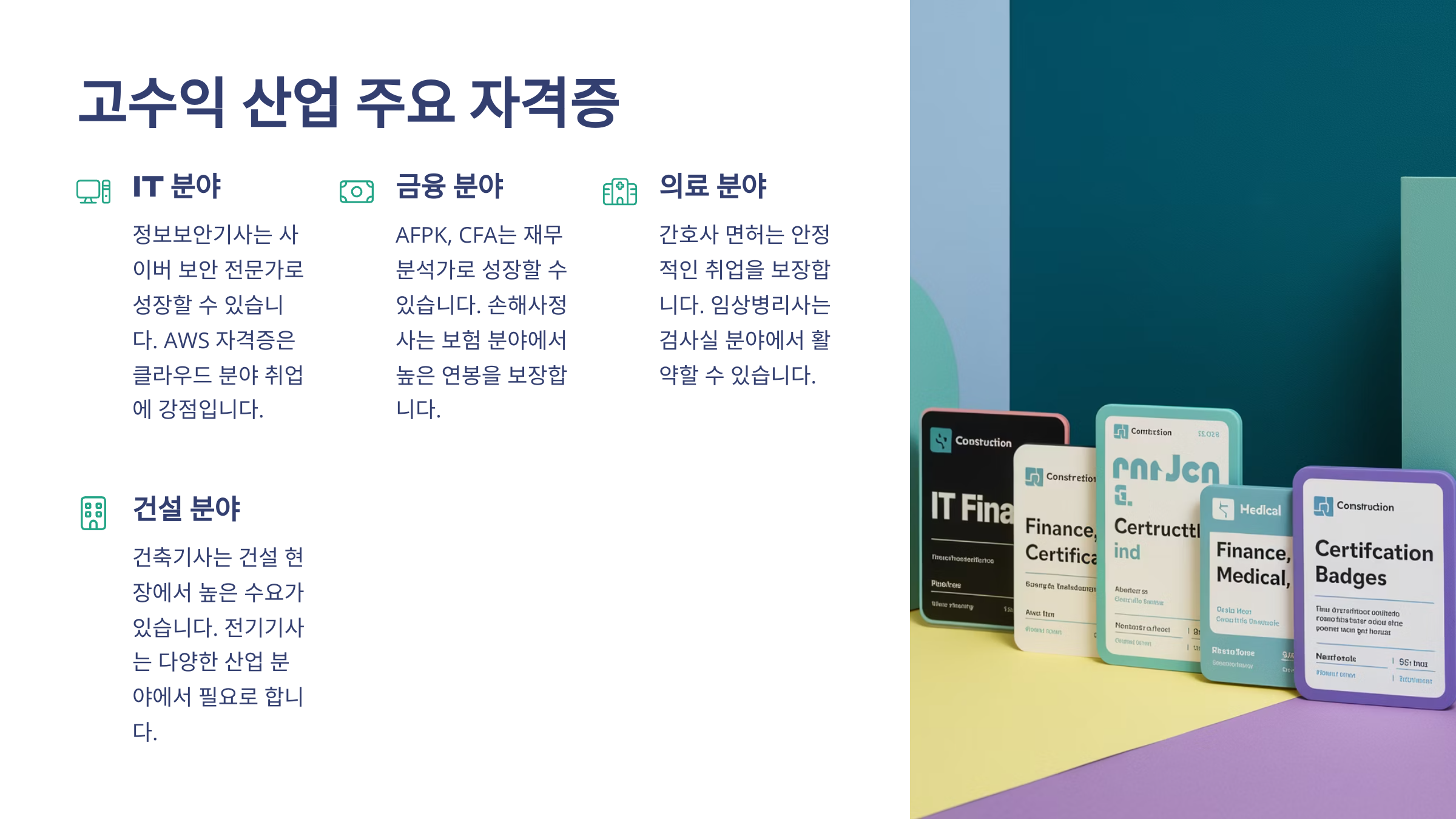 내가 생각했을 때, 이제는 무조건 하나쯤은 고소득 자격증을 가지고 있어야 살아남는 시대가 된 것 같아요. 자격증은 단순한 취업용이 아니라, 직업의 안정성과 연봉을 결정짓는 핵심 요소로 자리잡고 있어요.