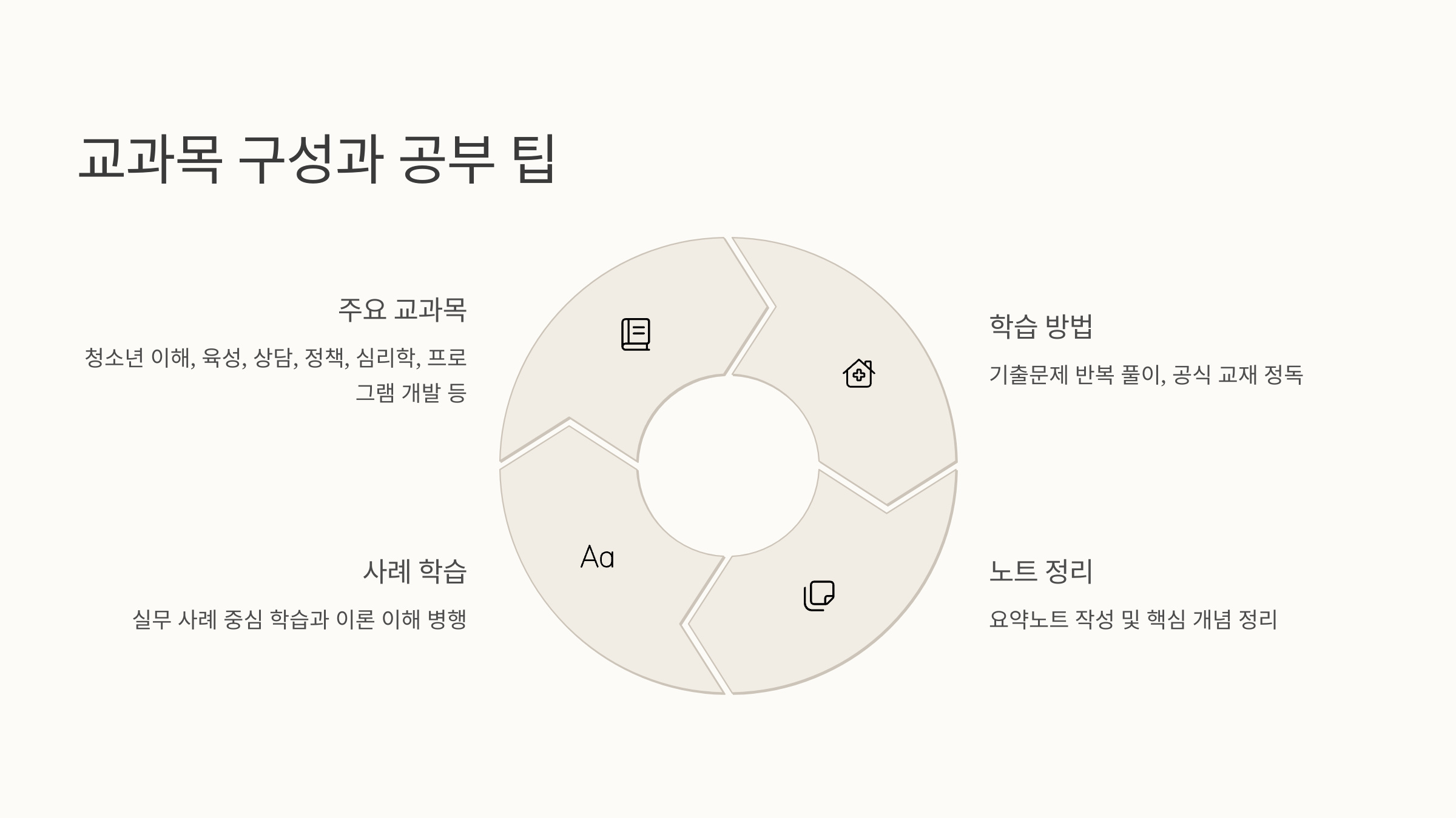 교과목은 단순 암기보다는 이해 중심으로 학습하는 게 좋아요. 특히 청소년상담이나 문제 행동 대처 같은 실무와 연계된 내용은 면접에서 그대로 활용되는 경우가 많아요. 따라서 ‘이론 → 적용 사례 → 나의 언어로 설명’이라는 흐름으로 공부하면 효과적이에요.