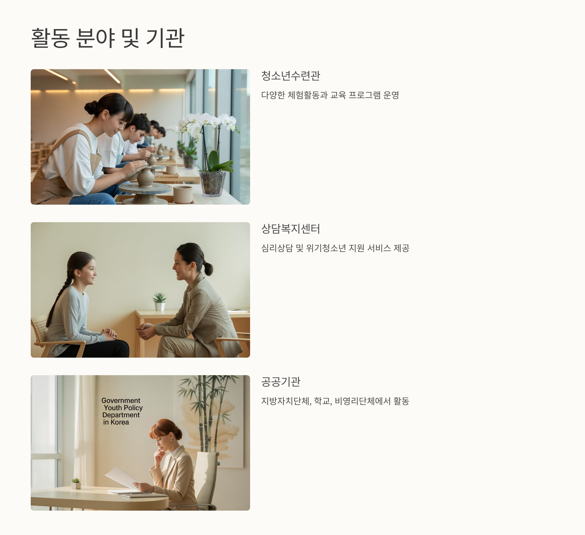 그 외에도 청소년 쉼터, 청소년자립지원관, 청소년 보호시설, 다문화가족지원센터 등에서 위기 청소년이나 보호대상 청소년을 위한 상담, 교육, 정서지원 활동도 가능해요. 특히 2급 이상 자격이 있으면 기관에서 더 신뢰받고 채용 시 우대돼요.