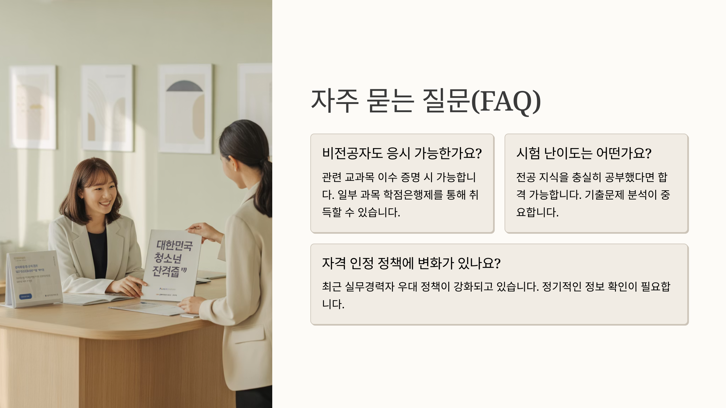 최종 합격자는 여성가족부 장관 명의의 국가자격증을 발급받게 되고, 청소년시설 및 공공기관에 취업 시 우대받을 수 있어요. 특히 공공기관 채용에서 자격증 소지자는 실무 경험으로 인정받기도 해서 취업 경쟁력도 높아요.
