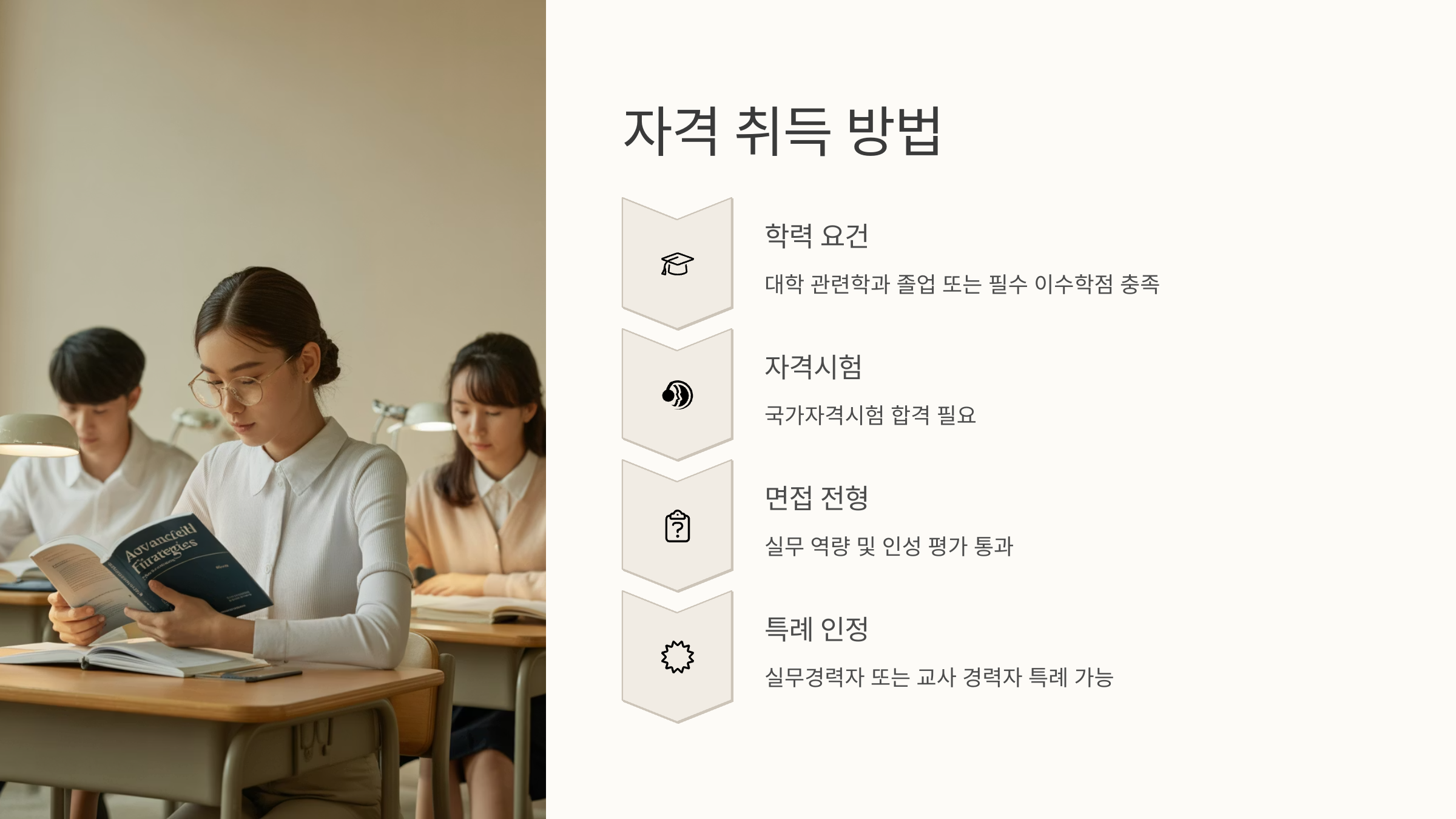 | 2급 | 학사 이상 + 필수 과목 이수 | 교과목 8과목 + 면접 | 비전공자도 가능 |