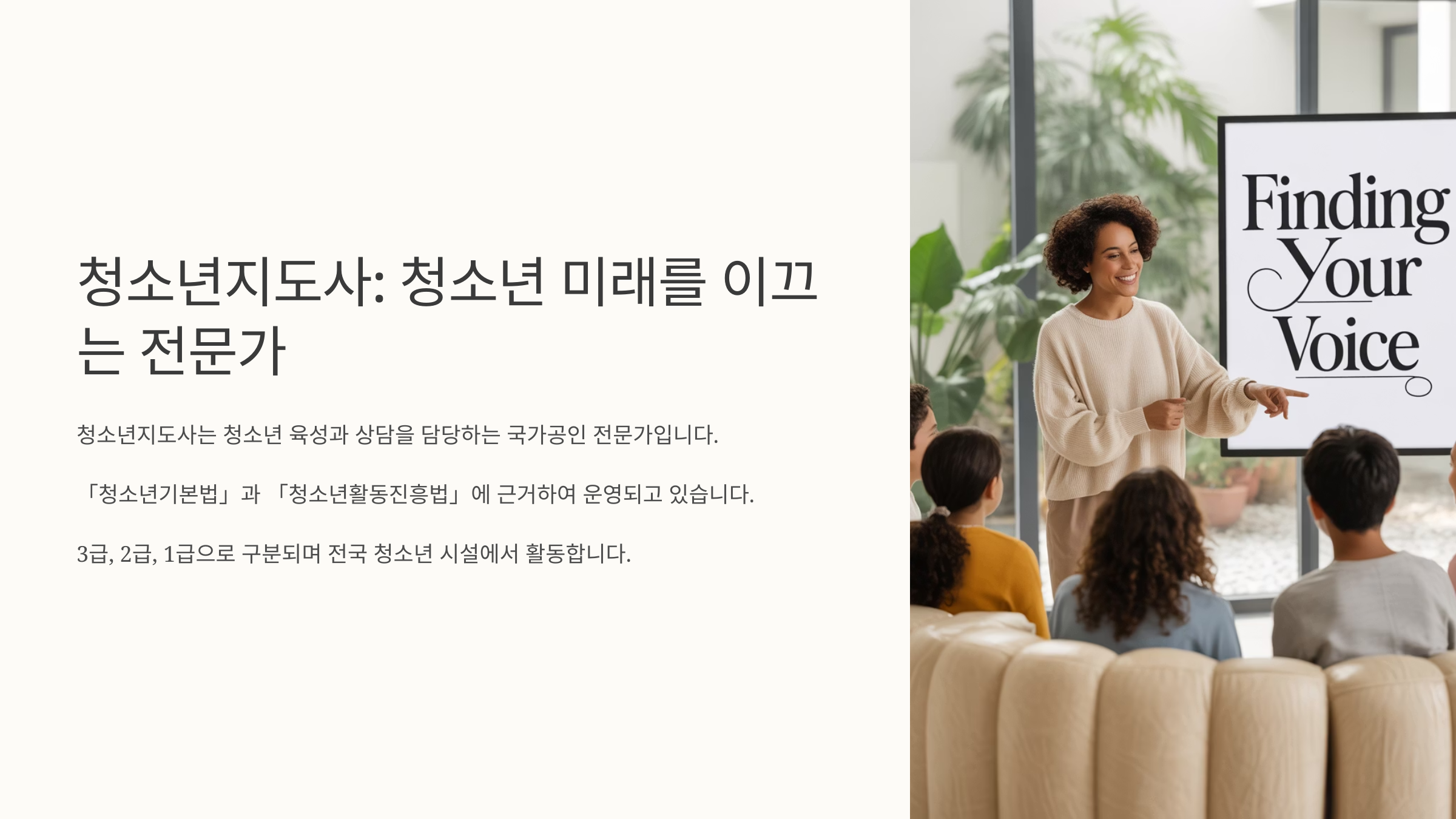 청소년지도사는 청소년의 건강한 성장을 도와주는 전문가예요. 상담, 진로 지도, 활동 기획, 청소년 프로그램 운영 등 다양한 역할을 수행해요. 단순한 멘토를 넘어서 삶의 방향을 함께 설계해주는 조력자라고 볼 수 있어요. 학교, 복지기관, 지자체, 청소년센터 등에서 활동할 수 있죠.