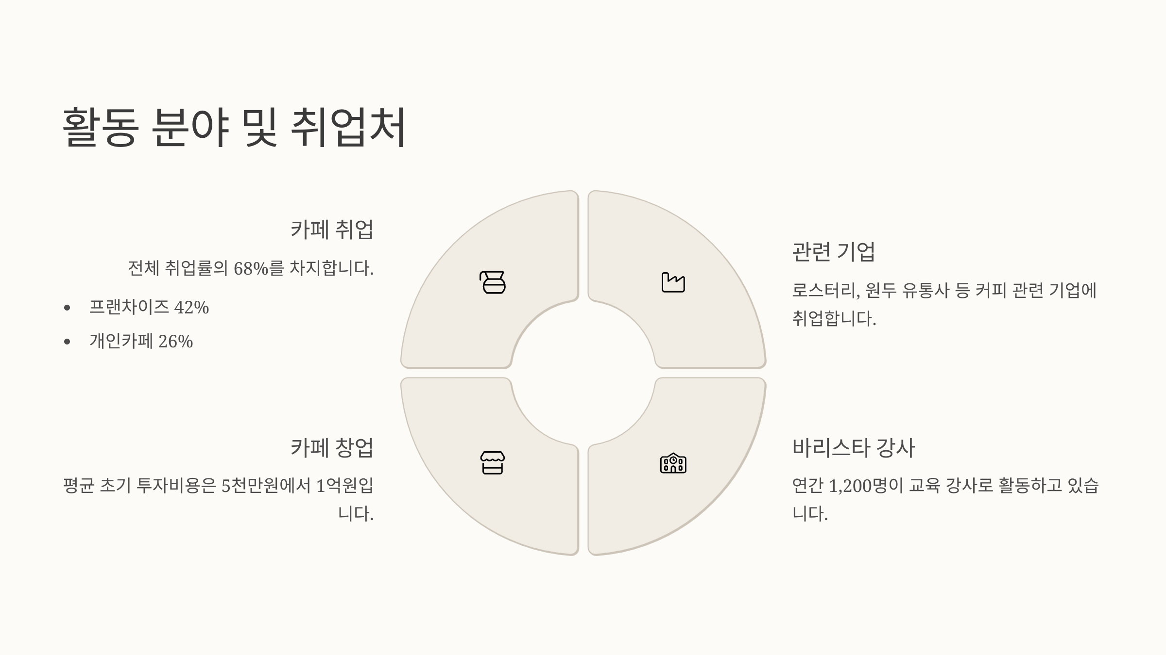 커피바리스타 2급 자격증을 취득하면 다양한 커피 관련 분야에서 활동할 수 있어요. 가장 일반적인 취업처는 프랜차이즈 카페, 개인 카페, 로스터리 매장 등이고, 커피 아카데미나 교육기관의 강사로도 일할 수 있어요. 실무 위주의 자격이기 때문에 현장 진입이 빠른 편이에요.
