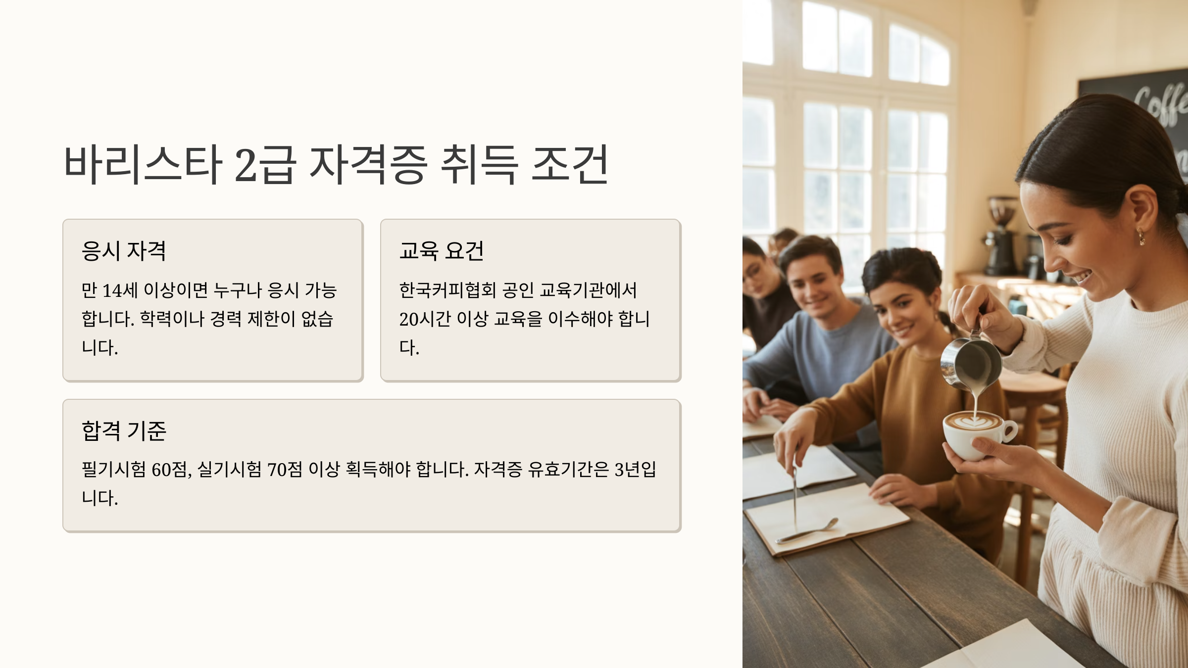 이제 바리스타의 의미를 알았으니, 다음은 커피바리스타 2급 자격증의 취득 조건을 살펴볼 차례예요! 계속 볼까요?