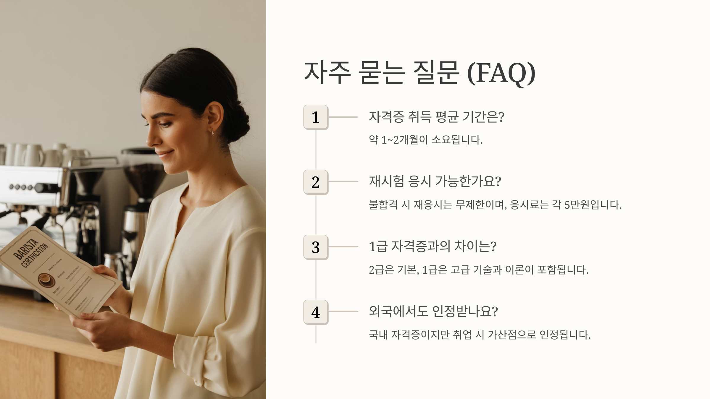 합격자는 보통 1~2주 내에 발표되며, 자격증은 기관에서 발급하거나 우편으로 발송해줘요. 자격증은 평생 유효하고, 취업이나 창업 시 ‘공신력 있는 실기 자격’으로 인정돼요. 카페에서 “바리스타 자격 있나요?”라고 물을 때 바로 보여줄 수 있는 실물 증서랍니다.