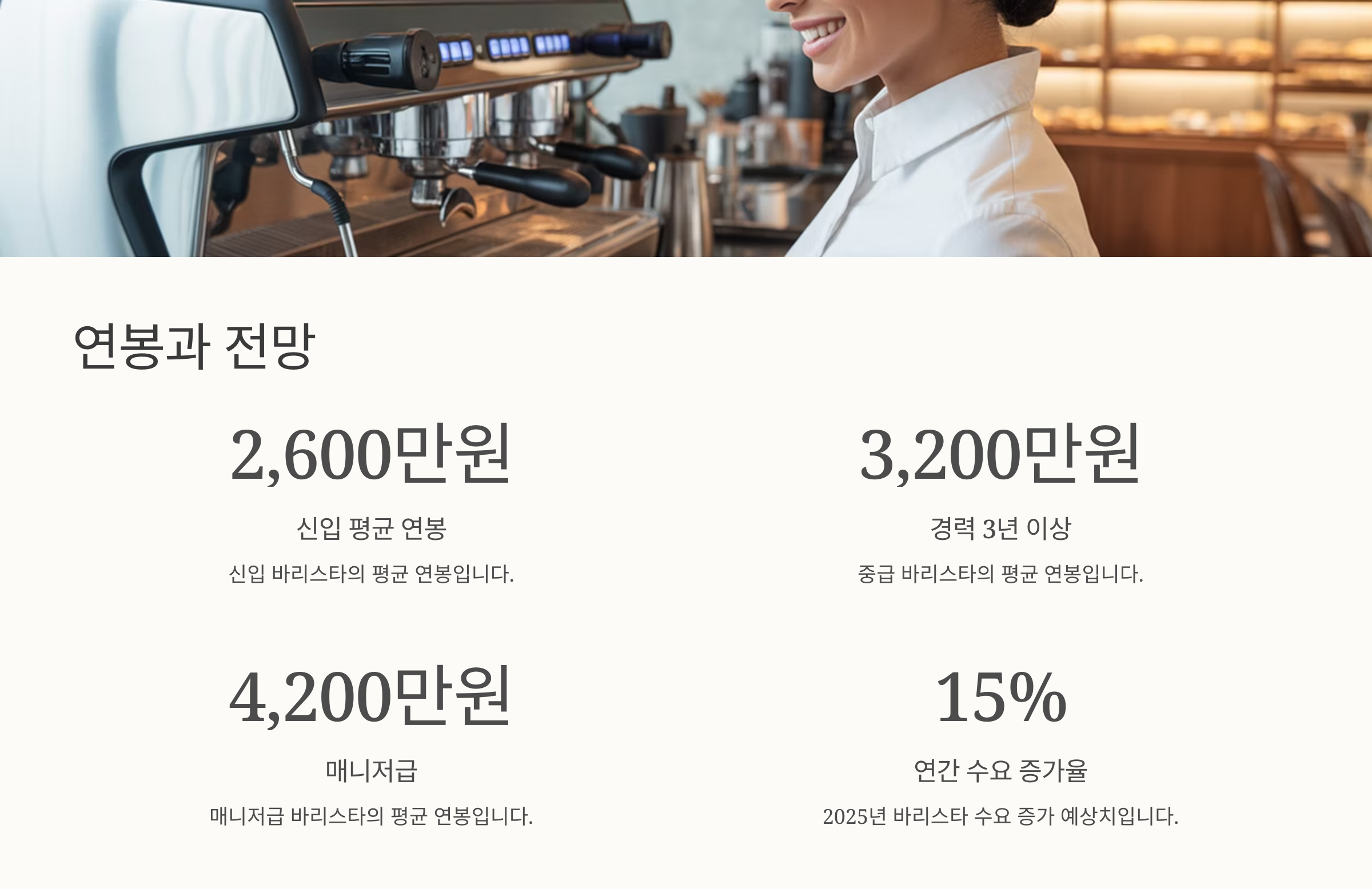 그럼 이제 커피바리스타 자격을 취득하면 연봉은 어느 정도인지, 어떤 미래가 펼쳐질 수 있는지 알아볼 차례예요! 다음 섹션으로 넘어가볼게요.