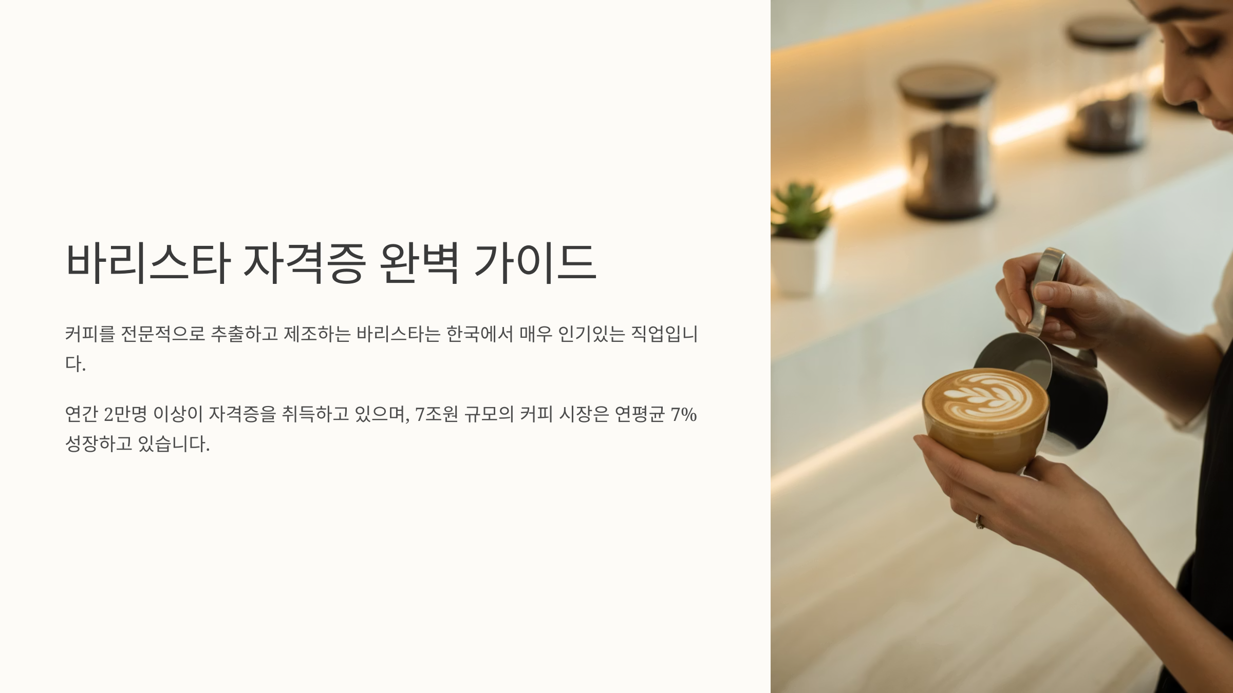 그럼 지금부터 커피바리스타 2급 자격증의 모든 것을 알아볼까요? 다음은 첫 번째 섹션 ‘바리스타란?’부터 자동으로 이어집니다! 계속 볼까요?