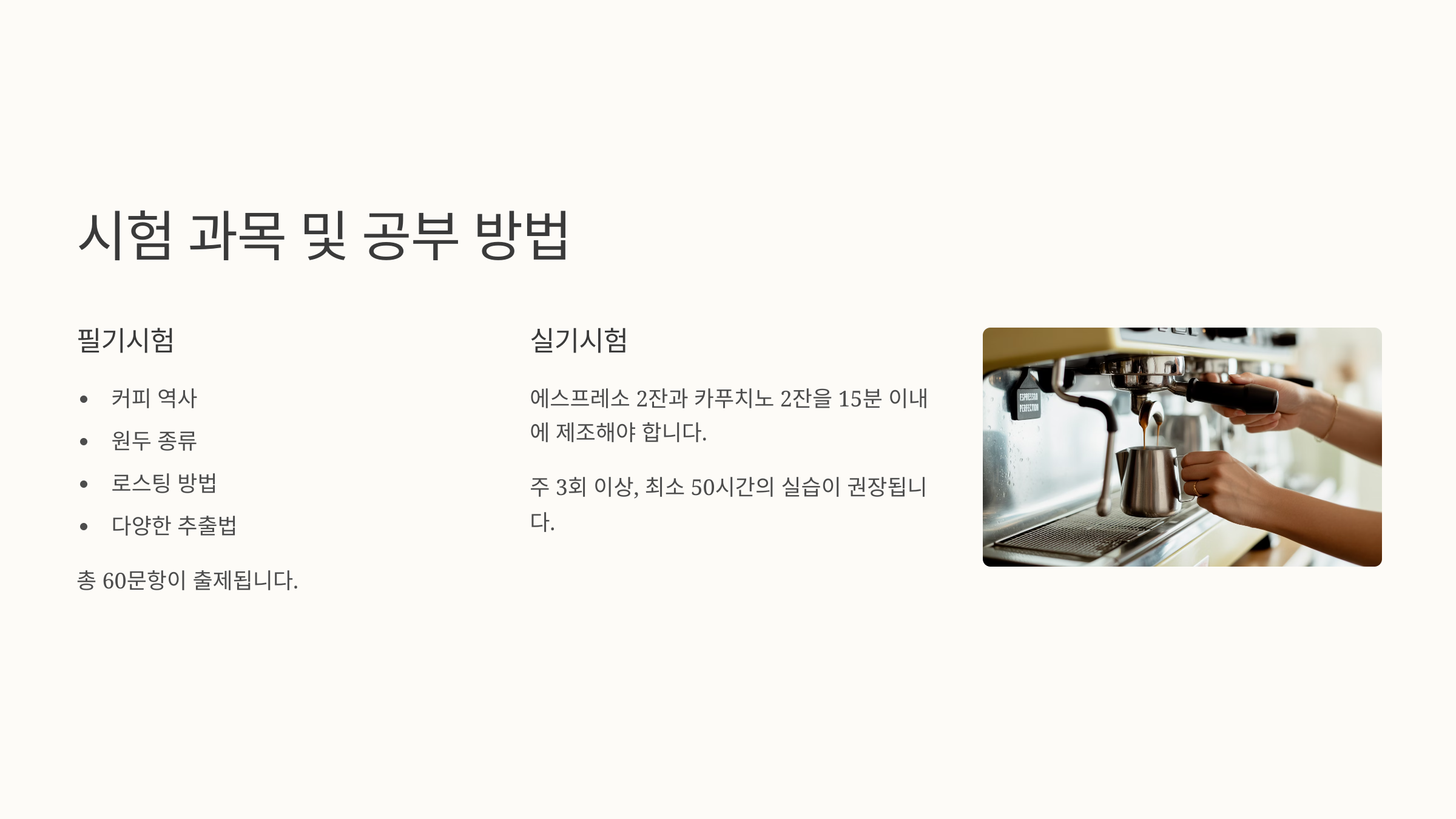 필기시험은 커피의 역사, 생두 이해, 로스팅 기본, 에스프레소 이론, 머신 구성, 추출 변수 등에 대한 이론을 중심으로 출제돼요. 실기시험은 실제 에스프레소 추출, 밀크 스티밍, 카푸치노 제조, 컵 정렬 등 현장 업무와 동일한 흐름으로 진행돼요.